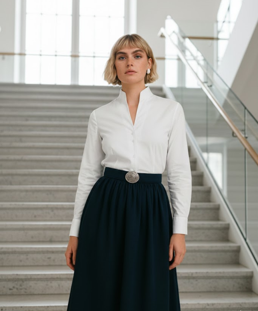 Elegante Trachtenbluse mit Kurzarm und Stehkragen. Das feine florale Muster in Blau oder in Grün verleiht ihr einen stilvollen und traditionellen Charakter.